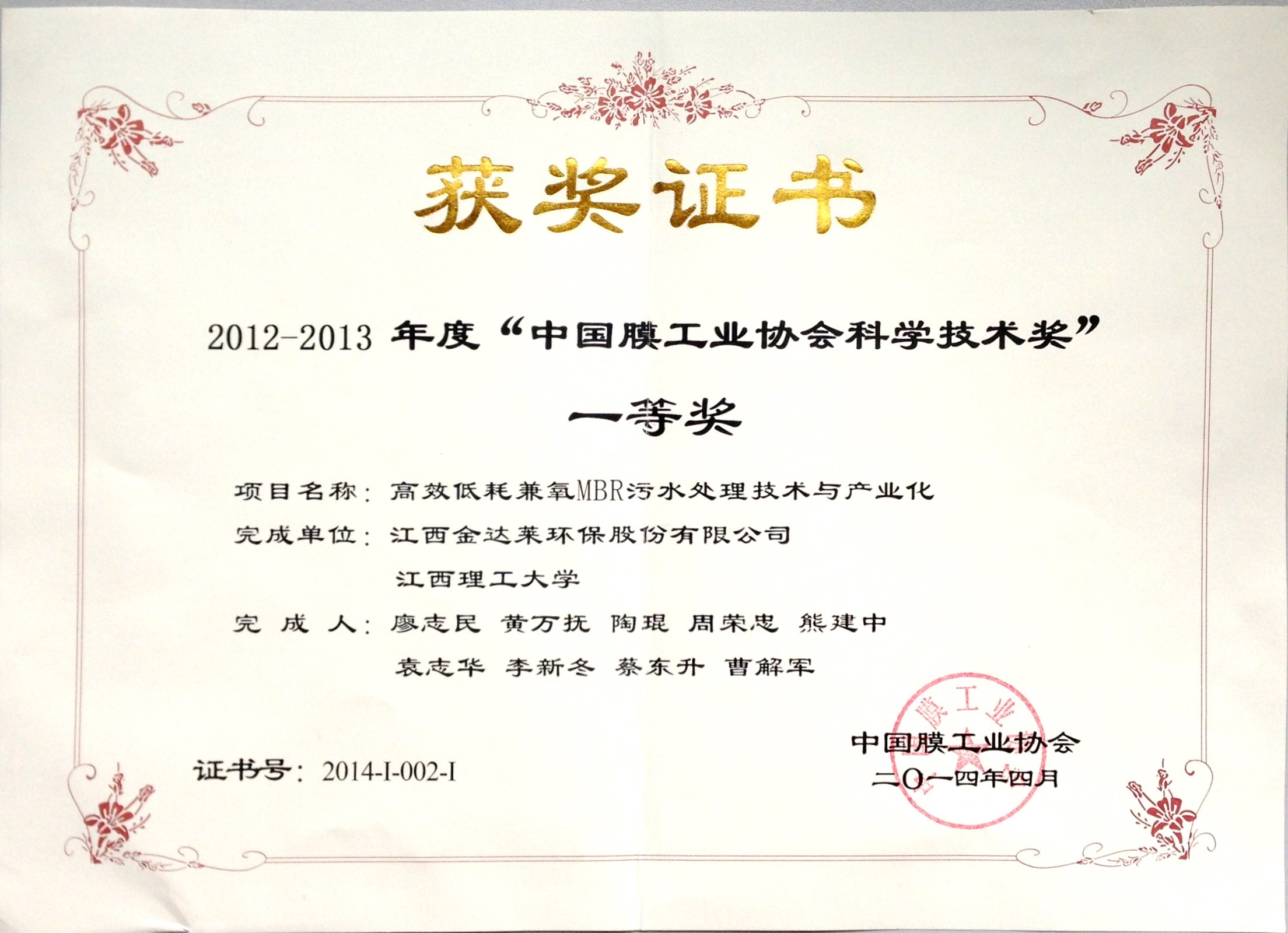 中國(guó)膜工業(yè)協(xié)會(huì)科學(xué)技術(shù)一等獎(jiǎng)